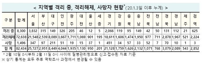 사망자 수는 10명이 늘어 누적 1496명을 기록했다. 치명률은 1.81%다. 위중증 환자는 170명으로 전날보다 14명 줄었다. 신규 격리해제자는 412명이며, 현재 8300명이 격리 중이다.