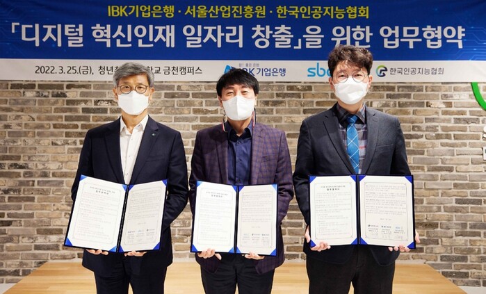 IBK기업은행(은행장 윤종원)이 서울산업진흥원, 한국인공지능협회와 ‘디지털 혁신인재 일자리 창출을 위한 업무협약’을 지난 25일 체결했다고 밝혔다.