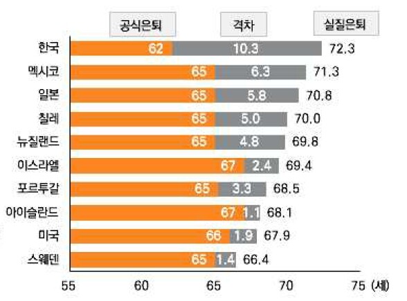 노동시장에서 퇴장하는 실질 은퇴 연령은 평균 72.3세(2018년)이며, 국민연금 수급 개시 연령인 공식 은퇴 연령(62세)와의 차이는 10.3년으로 각각 OECD 국가 중 가장 길다. 실질 은퇴가 점차 늦어지는 추세로, 경제적 노후준비 부족 상황이 지속되고 있는 것으로 파악된다.