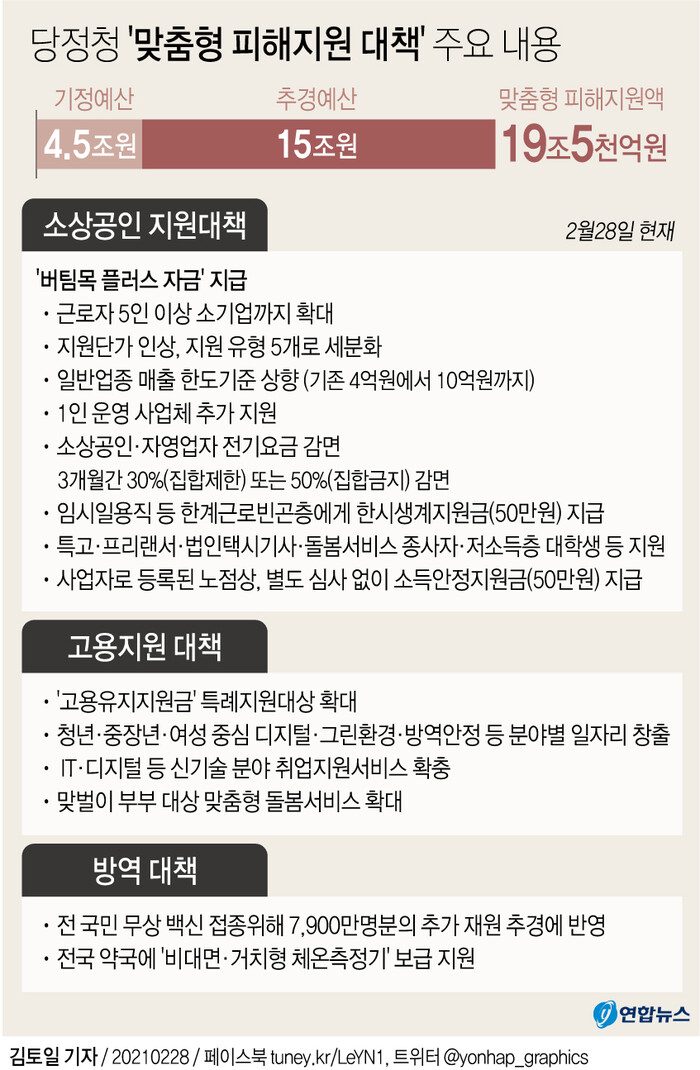 허 대변인은 “당정청은 코로나19 지속 방역 조치 장기화에 따른 피해누적과 고용상황 악화로 인한 민생의 어려움을 엄중히 받아들이고, 2021년 추경 편성과 기정예산 지원 패키지 2개 부문으로 구성된 맞춤형 피해지원 대책을 총 19.5조원 규모로 마련하기로 합의했다”고 설명했다.