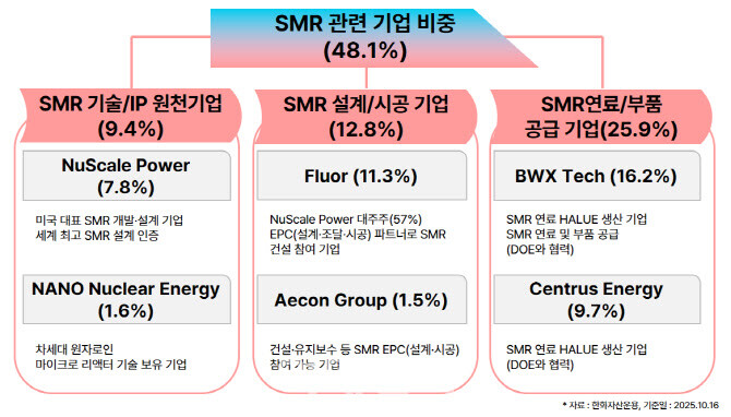 이에 따라 PLUS 글로벌원자력밸류체인 ETF의 수혜가 기대된다는 것이 한화운용의 설명이다. 해당 ETF는 SMR 기술 IP 등 원천기술을 보유한 △뉴스케일파워(7.8%) △나노뉴클리어에너지(1.6%), SMR을 실제 건설하고 핵심기자재를 납품하는△BWX테크(16.2%) △플루오르(11.3%) △에이콘그룹(1.5%), SMR의 연료가 되는 HALEU(고농축우라늄)를 독점 공급하는 △센트러스에너지(9.7%) 등을 담고 있다.