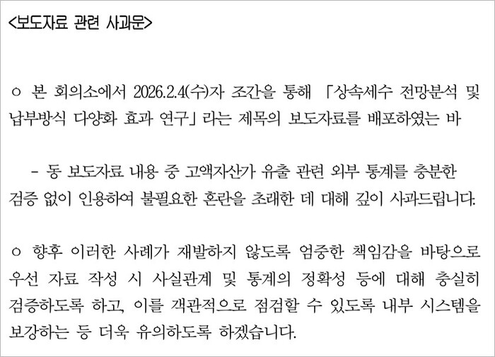 또 “현행 제도상 가업상속공제를 통해 최대 600억 원까지 감면이 가능하고, 10억 원까지 기본 공제가 적용돼 실제 상속세 납세자는 전체의 약 3%에 불과하다”며 “‘상속세 때문에 기업이 무너진다’는 주장은 과장된 서사에 불과하다”고 밝혔다.