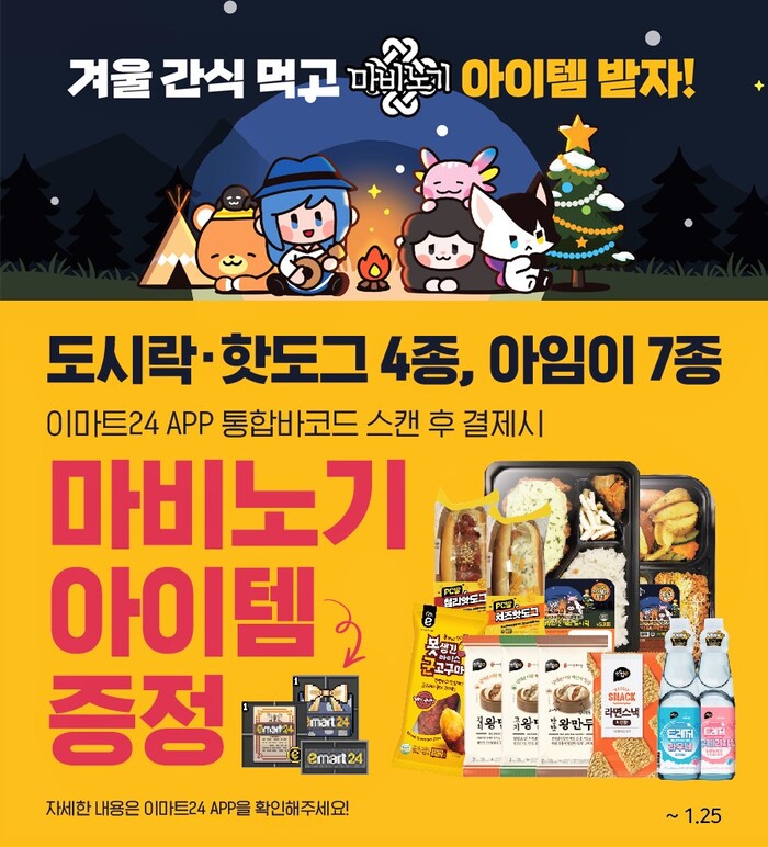 이마트24는 16일부터 내달 25일까지 넥슨의 대표 MMORPG ‘마비노기’와 손잡고 게임 아이템을 증정하는 겨울 간식 프로모션을 진행한다고 밝혔다.