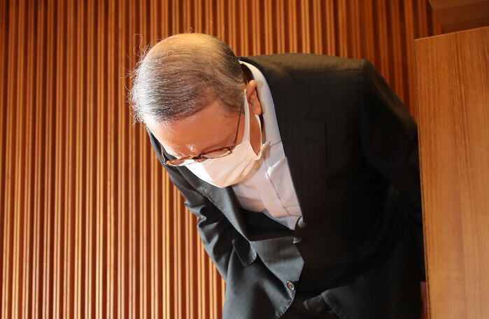 | ▲ 홍원식 남양유업 회장이 지난 4일 오전 서울 강남구 남양유업 본사에서 열린 기자회견 도중 허리를 숙여 사과하고 있다. [사진=연합뉴스] |