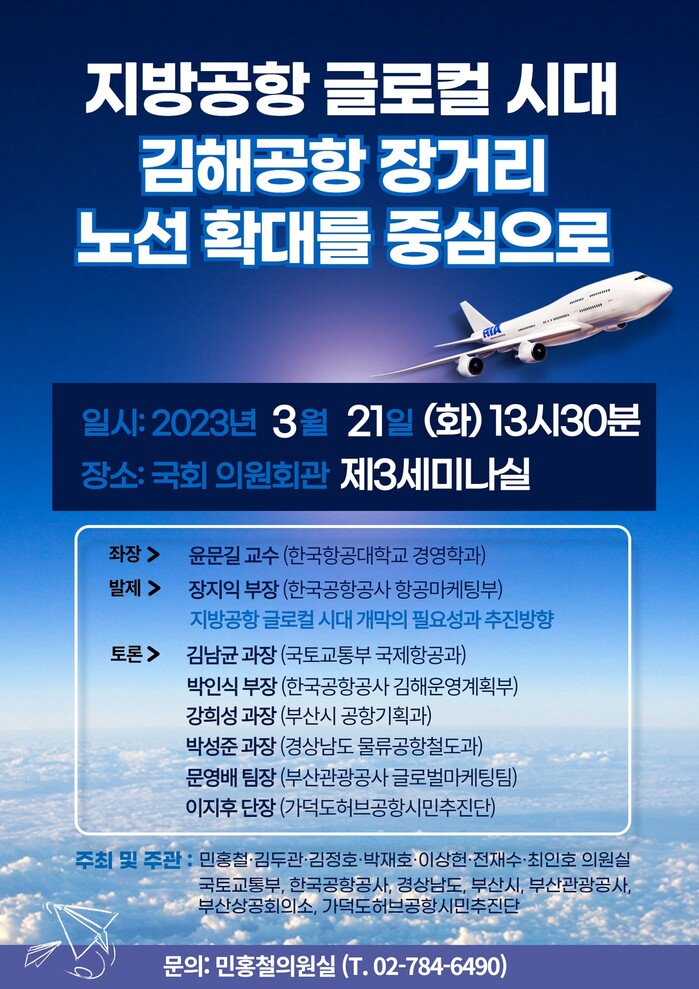 [메가경제=문기환 기자] 더불어민주당 민홍철 의원(국토교통위원회,경남 김해갑)은 21일 국회 의원회관 제3세미나실에서 ‘지방공항 글로컬 시대, 김해공항 장거리 노선 확대를 중심으로’를 주제로 토론회를 개최한다고 밝혔다 .