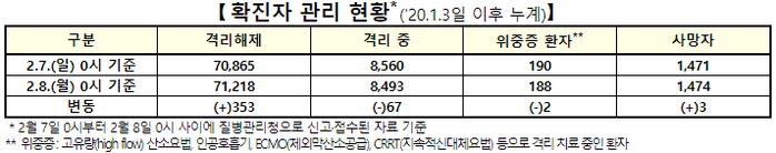 ▲ 8일 0시 기준 코로나19 확진자 관리 현황. [출처= 중앙방역대책본부] |
