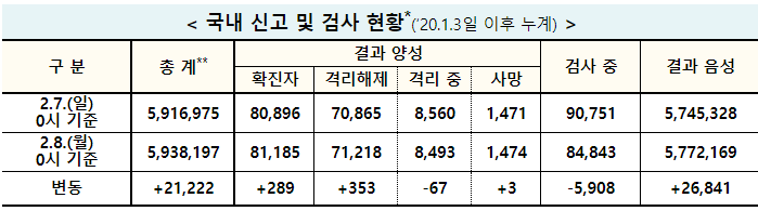 ▲ 8일 0시 기준 코로나19 국내 신고 및 검사 현황. [출처= 중앙방역대책본부] |