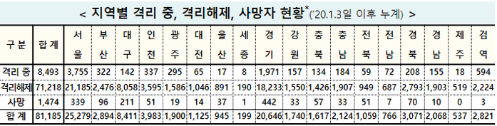 ▲ 8일 0시 기준 코로나19 지역별 격리 및 사망자 현황. [출처= 중앙방역대책본부] |
