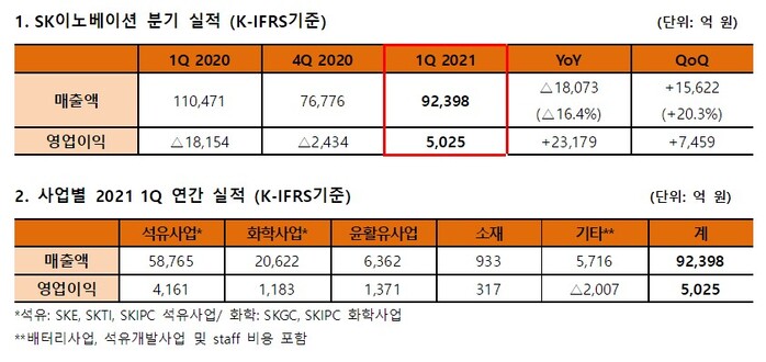 SK이노베이션은 13일 매출액은 전분기 대비 1조5622억원 증가한 9조2398억원, 영업이익은 전분기 대비 7459억원 증가한 5025억원을 기록했다고 밝혔다.