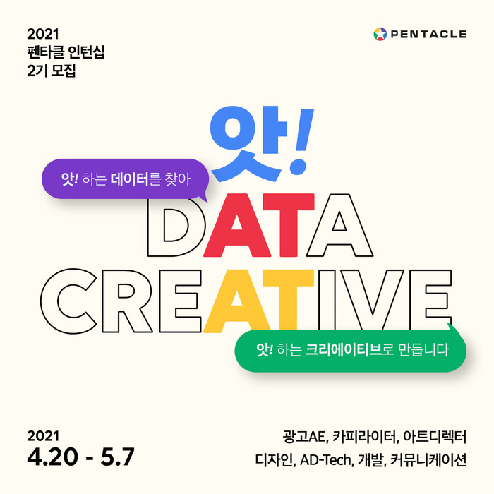 차상훈 펜타클 사업총괄 부사장은 “데이터 크리에이티브 선도 기업인 펜타클과 함께 국내 광고산업에서 디지털 혁신을 이룰 많은 인재들의 지원을 기다린다”며 “앞으로도 다양한 채널들을 통해 우수 인재 확보를 위해 적극적으로 나설 계획”이라고 말했다.