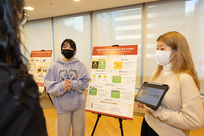 | ▲ 기업시민 레벨업 그라운드에서 학생들이 ESG경영 아이디어를 설명하고 있다 [사진=포스코그룹 제공] |