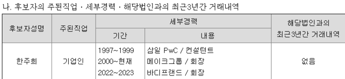 문제가 된 것은 이화공영이 공시한 자료의 후보자 세부경력란이다. 해당 공시에는 한주희 회장의 경력으로 ‘2022~2023년 바디프랜드 회장’ 이력이 기재돼 있다. 또한 1997~1999년 삼일 PwC 컨설턴트, 2000년~현재 메이크그룹 회장 등의 경력도 함께 포함됐다.