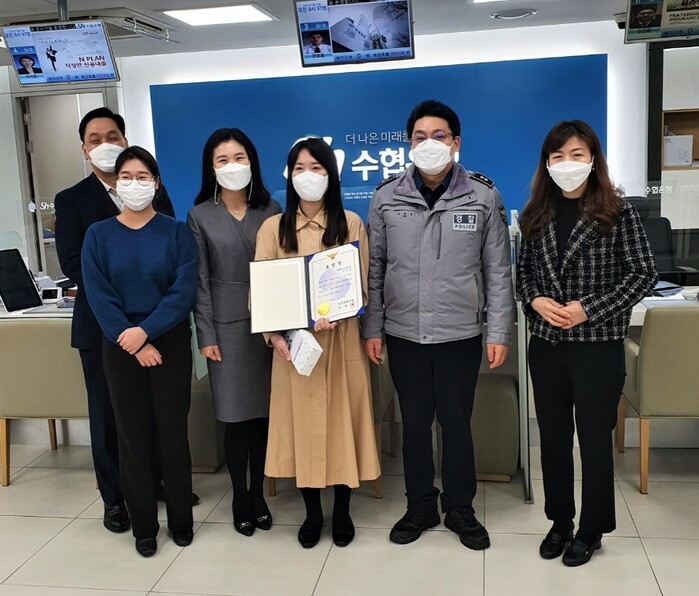 ▲ Sh수협은행(은행장 김진균)은 김포한강지점(지점장 김윤정) 직원들의 기지와 발빠른 대처로 대환대출을 가장한 보이스피싱 피해를 예방하고 고객의 소중한 자산을 지켜냈다고 4일 밝혔다. 사진은 보이스피싱을 예방한 이지은 대리 등 지점 관계자들이 김포경찰서로부터 표창장을 수여받고 기념촬영을 하는 모습 [사진=Sh수협은행 제공] |