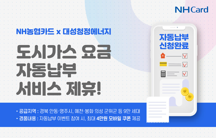 한편, NH농협카드는 8월 31일까지 NH농협 개인회원을 대상으로 ‘각종 생활요금 카드 자동납부 이벤트’를 진행하고 있다. 도시가스 요금을 포함한 생활요금 6종(아파트관리비, 도시가스, 교육비, 전기요금, 4대보험, 통신요금)에 대해 카드 자동납부 등록 시 최대 4만원 모바일쿠폰을 제공한다. 이벤트 응모방법, 행사내용 등 자세한 사항은 NH농협카드 홈페이지 또는 카드 스마트앱(스마트앱·NH pay) ‘진행중인 이벤트’ 페이지에서 확인할 수 있다.