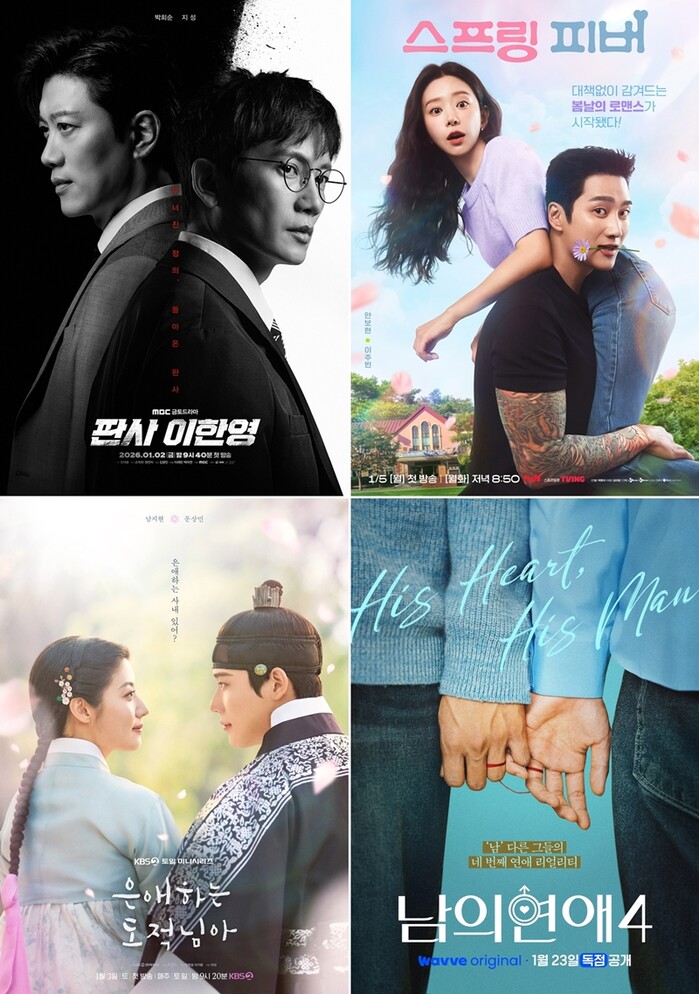 26일 웨이브에 따르면 2026년 1월 넷째 주 데이터 기준, 세 작품은 드라마 시청 시간과 시청 유저 수 부문에서 나란히 1~3위를 차지했다. 1위는 ‘판사 이한영’, 2위는 ‘스프링 피버’, 3위는 ‘은애하는 도적님아’로, 동시 흥행 구도가 뚜렷하게 나타났다. 특히 세 작품은 전주 대비 시청 시간 상승률에서도 모두 우상향 곡선을 그리며 눈에 띄는 성과를 보였다.