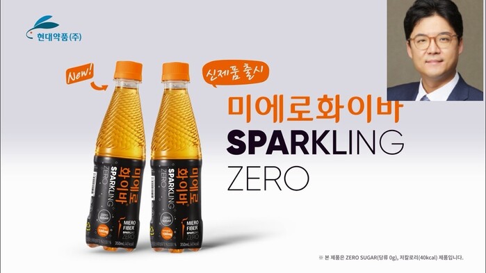 ▲ 현대약품 주력 제품 중 하나인 '미에로화이바', 네모 안은 이상준 대표. [사진=현대약품] |