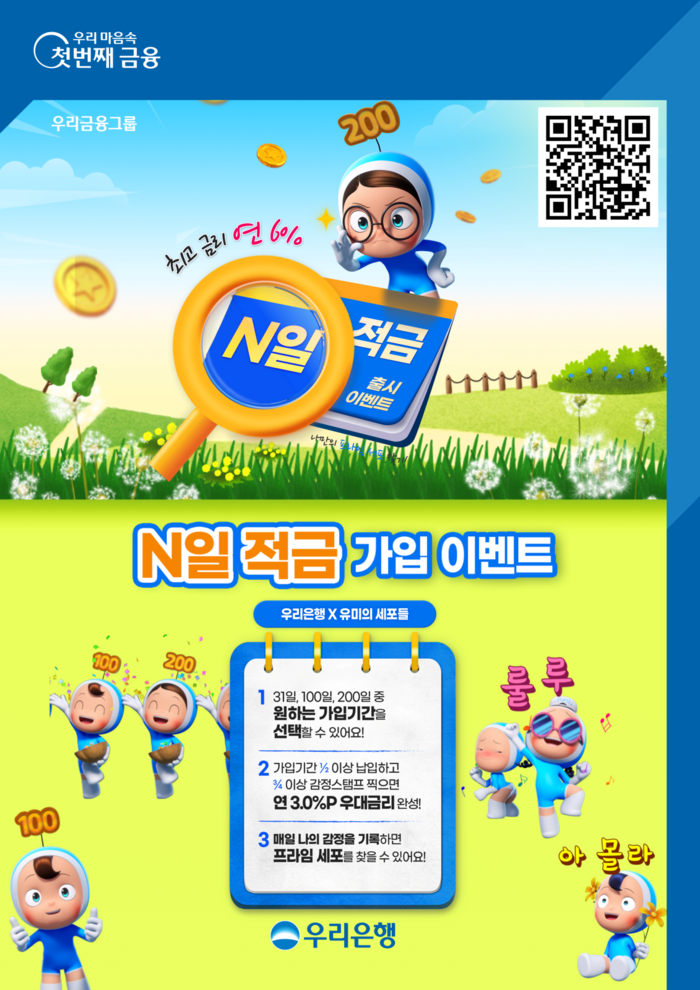 오는 16일부터 우리WON뱅킹 전용으로 판매 예정인 ‘N일 적금’은 웹툰 ‘유미의 세포들’의 세계관을 활용해 저축현황 관리 기능을 제공한다. 매일매일 적립하는 금액은 주인공 유미의 감정을 의인화한 ‘감정스탬프’로 감정다이어리에 적립돼 재미있게 납입 관리도 하고 우대금리 혜택도 받을 수 있다.