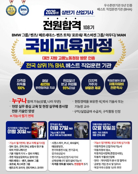 오는 2월 10일 개강 예정인 자동차정비산업기사 자격취득 양성과정은 NCS(국가직무능력표준) 기반의 체계적인 교육과정으로 초보자도 쉽게 시작할 수 있으며, 실무 실습과 이론 교육을 병행해 자격증 취득부터 취업까지 연결되는 교육 효과를 극대화한다. 이달 27일 개강 예정인 친환경 전기(전기내선공사) 관리자 양성 과정은 인입 전선로, 전원 및 전기공급설비, 방재설비 등 다양한 전기 시스템을 안전하고 효율적으로 시공·유지하는 실무 중심의 커리큘럼으로 운영된다.