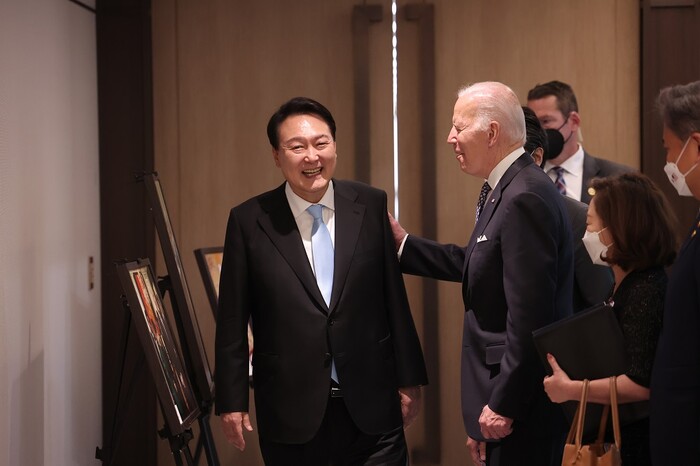 ▲ 윤석열 대통령이 21일 서울 용산구 대통령실 청사를 방문한 조 바이든 미국 대통령과 환담하며 웃고 있다. [서울=연합뉴스] |