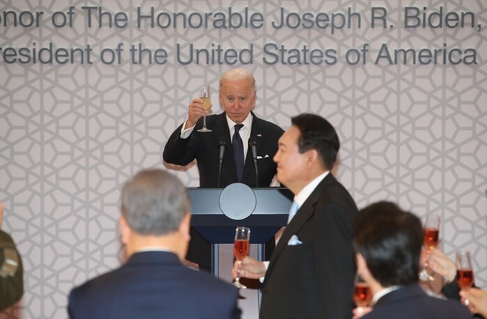 ▲ 조 바이든 미국 대통령이 21일 오후 서울 용산 국립중앙박물관에서 열린 환영 만찬에서 건배 제의를 하고 있다. [서울=연합뉴스] |