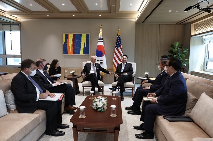 ▲ 윤석열 대통령과 조 바이든 미국 대통령이 21일 서울 용산 대통령실 청사 집무실에서 소인수 정상회담을 하고 있다. [서울=연합뉴스] |