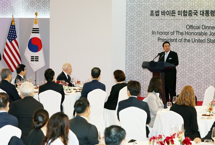 윤 대통령은 먼저 만찬사에서 “피로 맺어진 한미동맹은 자유민주주의와 시장경제에 기반한 성장과 번영을 이뤄가는 데 든든한 버팀목”라고 말했다.