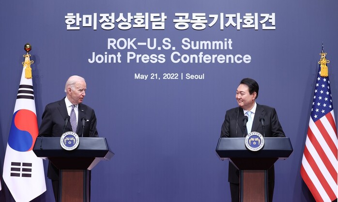 ▲ 윤석열 대통령과 조 바이든 미국 대통령이 21일 서울 용산 대통령실 청사 대강당에서 열린 한미 정상 공동기자회견에서 바라보고 있다. [서울=연합뉴스] |