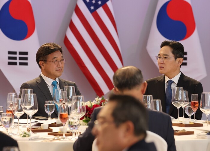 ▲ 21일 오후 서울 용산 국립중앙박물관에서 열린 조 바이든 미국 대통령 환영 만찬에 참석한 이재용 삼성전자 부회장과 더불어민주당 윤호중 공동비대위원장이 대화하고 있다. [서울=연합뉴스] |