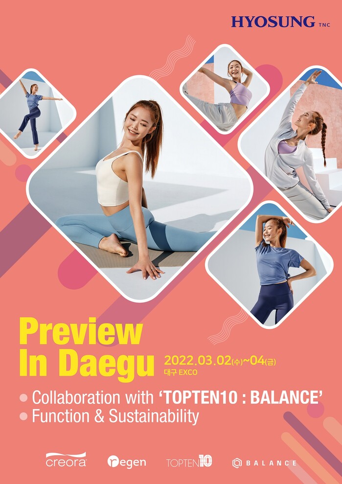 이번 전시회에서 효성티앤씨는 국내 SPA 브랜드 탑텐과 협업해 레깅스‧팬츠 등 액티브웨어인 ‘밸런스’ 제품들을 대거 공개한다.