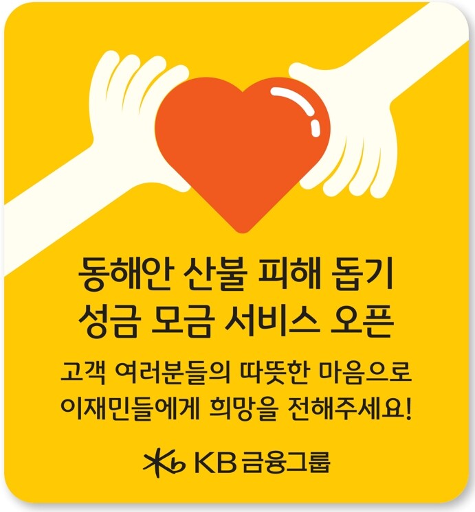 KB금융그룹(회장 윤종규)은 동해안 지역의 산불 피해 복구 및 주민 지원에 도움을 드리길 희망하는 고객들이 편리하고 간편하게 기부에 참여할 수 있는 ‘산불 피해 성금 모금 서비스’를 오픈했다고 11일 밝혔다.