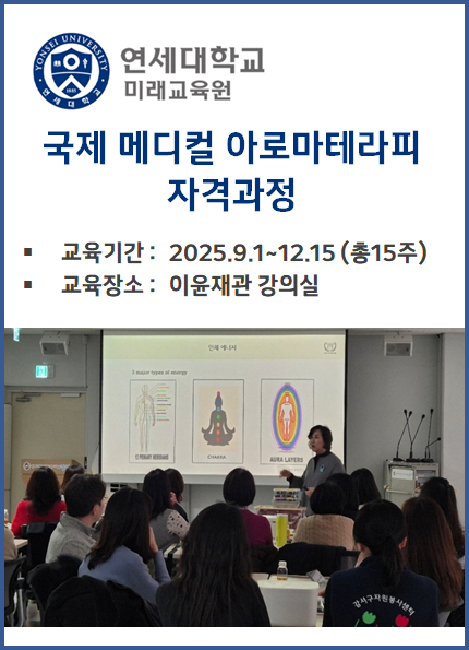 [메가경제=양대선 기자] 연세대학교 미래교육원이 오는 9월 1일 '국제 메디컬 아로마테라피 자격과정'을 개설하고 첫 수강생을 맞는다고 31일 밝혔다. 특히 국내 강사 자격 과정과 ISO 인증 국제 자격 과정을 모두 포함하고 있어 업계의 관심이 모아지고 있다.