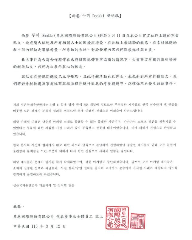 성은국제유한공사(두끼 대만 운영사)는 "대만 파트너가 단독으로 진행한 부적절한 마케팅 게시물로 한국 선수단과 팬들에게 불편을 끼친 점에 대해 사과한다"며 "해당 게시물은 삭제했고 관련 마케팅도 중단했다"고 밝혔다.