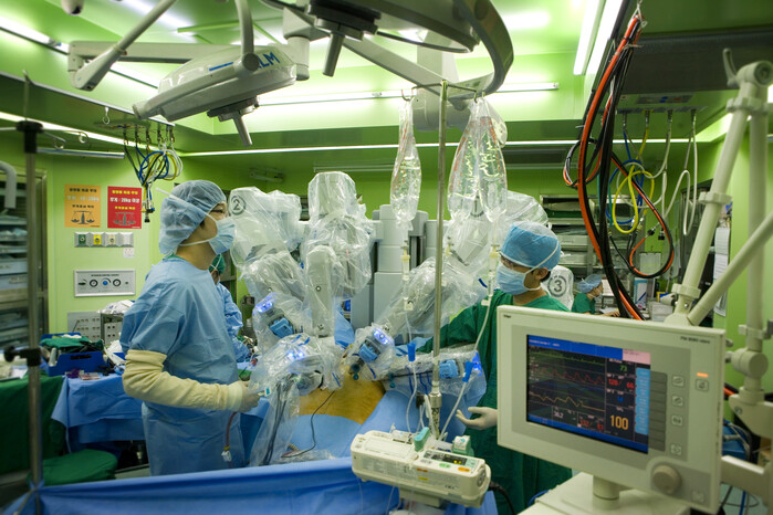 ▲ 다빈치 로봇으로 최소 침습수술을 진행하고 있다[사진=한양대병원] |