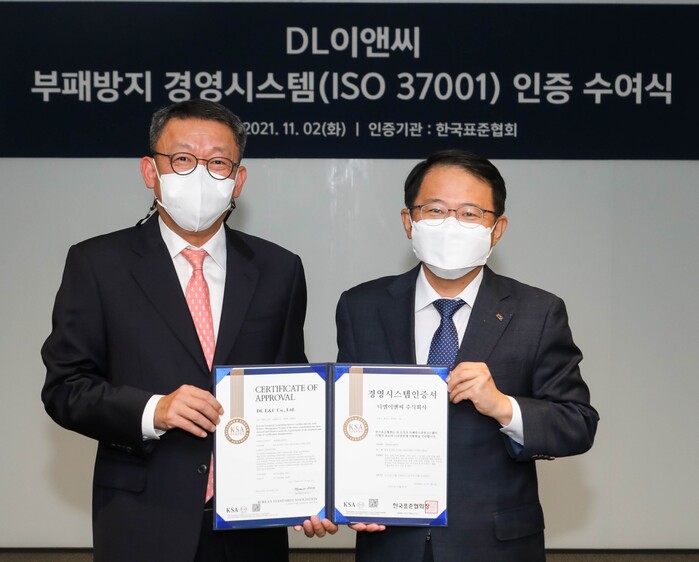 수여식에는 배원복 DL그룹 부회장과 강명수 한국표준협회 회장이 참석했다. ISO 37001은 기업이 부패 방지를 위해 국제기준에 부합하는 경영시스템을 갖췄는지 종합 평가해 국제표준화기구(ISO)가 부여하는 인증으로 지난 2016년 제정됐다.