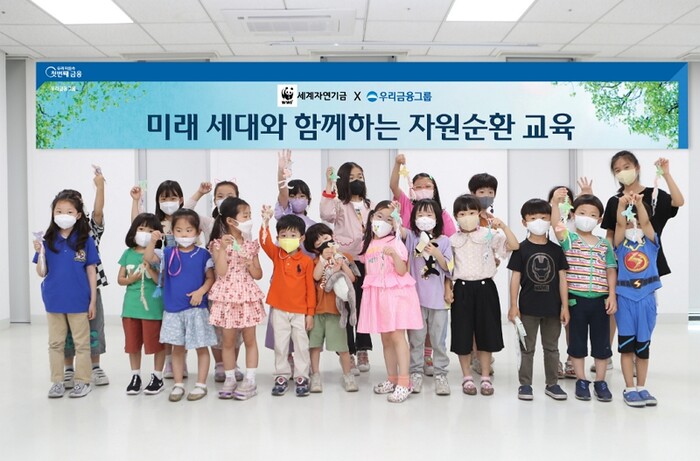 우리금융그룹이 미래세대인 어린이들을 대상으로 WWF(세계자연기금)와 함께 순환경제 달성을 위한 자원순환 교육을 진행했다. 5일 환경의 날을 맞아 자연회복 및 순환경제의 중요성을 공감하고 인식제고를 위해 이번 교육을 준비한 것. 업사이클링 체험활동 등 눈높이 교육을 통해 미래세대와 순환경제 공감대를 형성하는 활동을 펼쳤다.