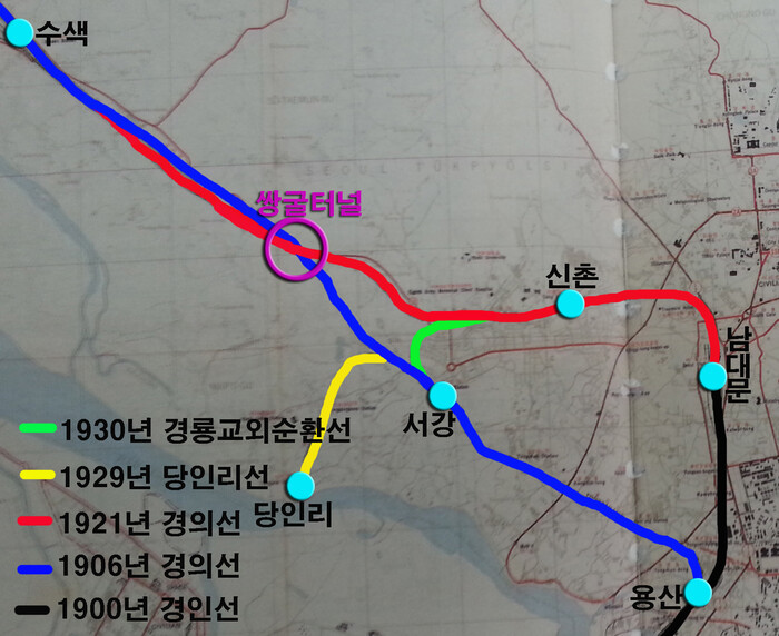 이 약도를 통해 쌍굴터널 북쪽에 있던 수색역이 1940년 남쪽으로 이전 신축되었으며, 쌍굴터널은 수색조차장 측선에 위치하여, 1960년대 서울~문산 간 열차 차장으로 승무 중 수색역을 지나면서도 볼 수 없었던 선로로, 1940년 조성된 조차장과 관련이 없는 옛 선로이며, 수색조차장에서는 1946년 이후 도착 여객열차의 세척 및 정비와 새로운 출발 열차를 조성하는 등 조차장으로 사용된 것이다.
