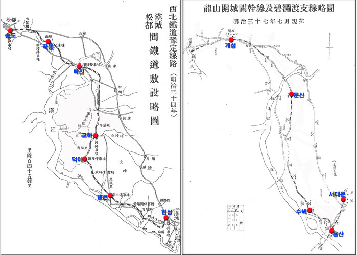 | ▲ 사진 좌부터 1901.서북철도 예정선과 1904.군용철도 선로 |