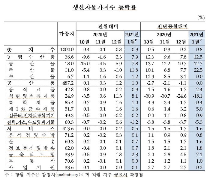 생산자물가를 1년 전과 비교하면 0.8% 올랐다. 농림수산품이 12.5% 상승했고, 서비스 생산자물가는 1.6% 상승세를 보였다. 반면 공산품은 전년 수준을 유지했고,전력·가스·수도 및 폐기물은 5.3% 하락했다.
