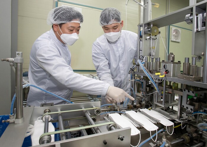 ▲ 대전에 위치한 마스크 제조기업 '레스텍'에서 박나원 공장장(오른쪽)과 삼성전자 스마트공장지원센터 권오창 멘토(왼쪽)가 마스크 본체와 귀끈 연결 상태를 점검하고 있다. [사진= 삼성전자 제공] |