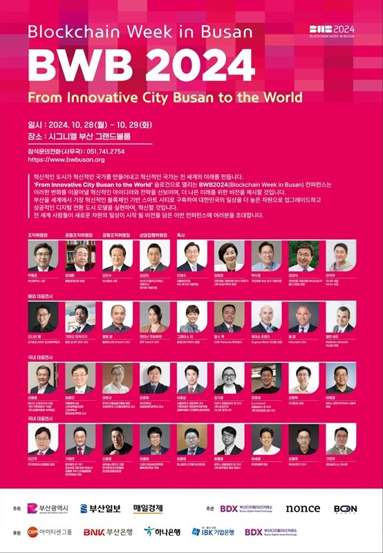 [메가경제=양대선 기자] 블록체인 위크 인 부산(Blockchain Week in Busan) 2024(BWB2024)가 오는 10월 28일부터 29일까지 이틀 간 시그니엘 부산에서 개최된다.