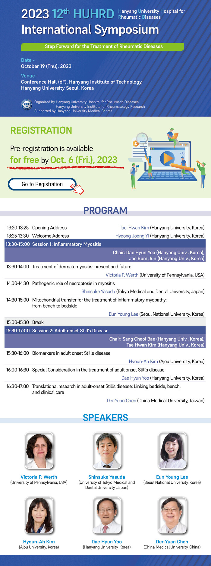 이번 ‘HUHRD 국제 심포지엄’의 첫 번째 세션은 ‘염증성 근염’을 주제로 유대현 한양대류마티스병원 류마티스내과 교수와 전재범 교수가 좌장을 맡고, 빅토리아 워스 교수(미국 펜실베니아대학교)가 ‘피부근염의 치료: 현재 및 미래(Treatment of dermatomyositis: present and future)’, 야스다 신슈케 교수(도쿄 의과치과대학)가 ‘근염의 발생 기전에서 necroptosis의 역할(Pathogenic role of necroptosis in myositis)’, 이은영 교수(서울대 의대)가 ‘염증성 근염의 치료에서 미토콘드리아 이식: 실험실에서 환자 치료까지(Mitochondrial transfer for the treatment of inflammatory myopathy: from bench to bedside’를 주제로 강연한다.
