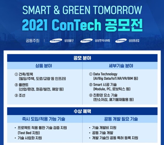 삼성물산과 삼성엔지니어링, 삼성중공업의 설계·조달·시공(EPC) 3사가 국내 EPC 융복합 기술 발전을 위해 '2021 스마트 앤 그린 투모로우 콘테크 공모전'을 진행한다고 29일 밝혔다.
