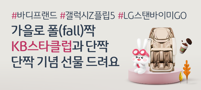 [메가경제=송현섭 기자] KB국민은행은 오는 10월2일까지 KB스타클럽에 처음 등록하는 고객들을 대상으로 ‘가을로 폴(fall)짝! KB스타클럽과 단짝!’ 이벤트를 실시한다고 14일 밝혔다.