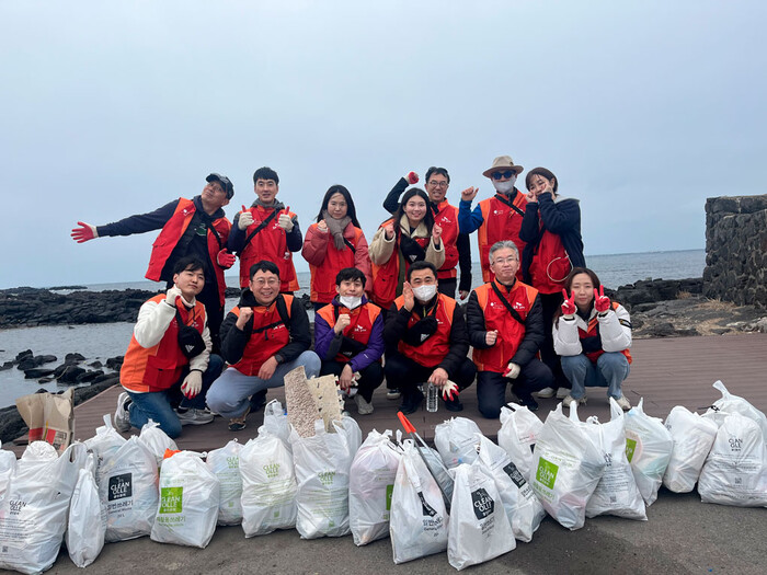 ▲ SK핀크스 구성원들이 해양 쓰레기를 수거하고 있는 모습. [사진=SK핀크스] |