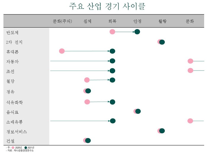 연구소는 분석대상 12개 산업 중 반도체(회복→안정), 휴대폰·자동차·조선·소매유통(둔화→회복), 철강·석유화학(침체→회복) 등 7개 산업의 경기 사이클이 올해에 비해 개선될 것으로 예상했다.