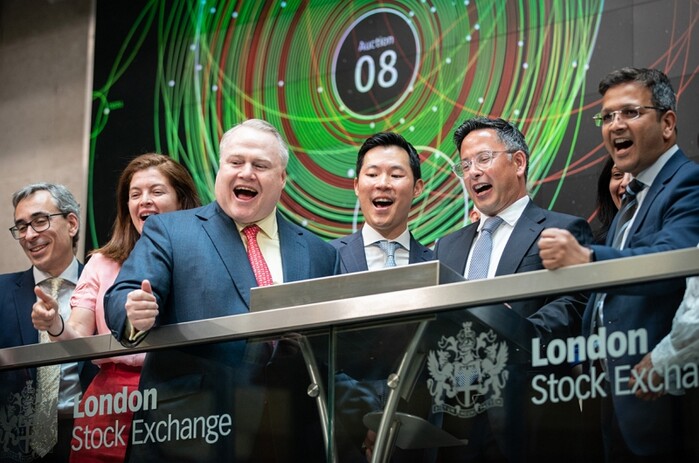 영국 현지시간 기준 지난 20일, 런던거래소에 최초로 한국지수를 기초자산으로 하는 3배 레버리지 상품의 성공적인 상장을 기념해 '클로징벨' 행사가 진행됐다.