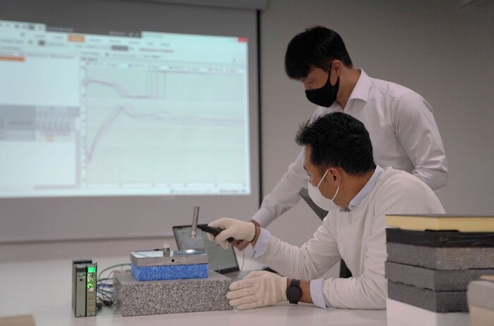 ▲ 롯데건설 관계자가 층간완충재 실험 결과를 확인하고 있는 모습 [사진=롯데건설 제공] |