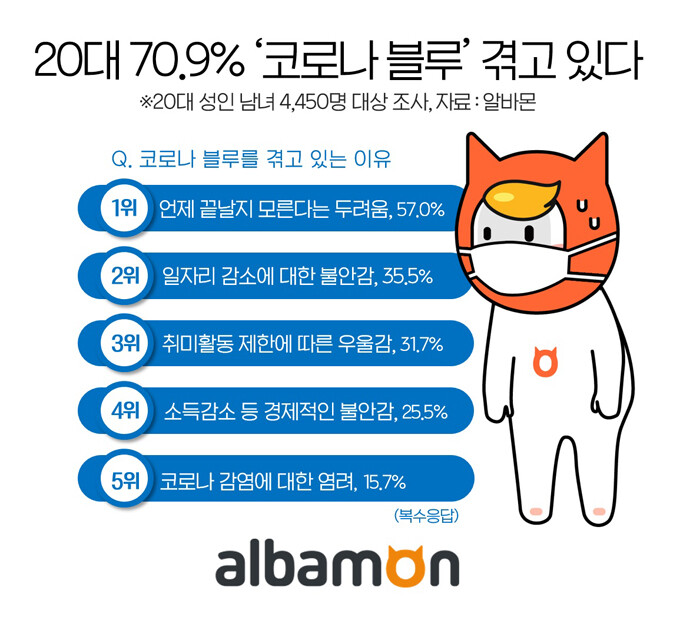 아르바이트 구인구직 포털사이트 알바몬은 20대 성인남녀 4,450명을 대상으로 ‘코로나 블루’ 현황에 대해 조사한 결과, 설문에 참여한 20대 중 70.9%가 ‘코로나 블루를 겪고 있다’는 것으로 조사됐다고 24일 밝혔다.