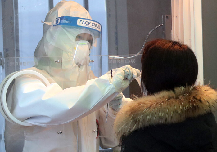 ▲ 5일 오전 서울역광장에 설치된 임시선별진료소에서 의료진이 검체를 채취하고 있다. [서울= 연합뉴스] |