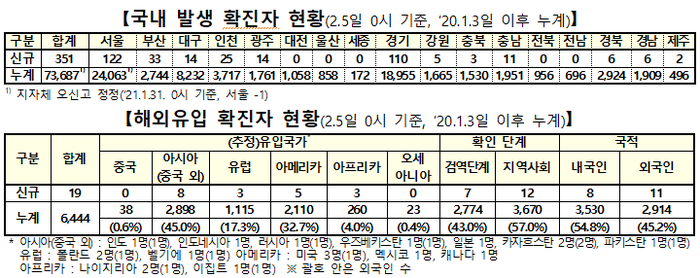 국내발생 확진자 중 수도권 발생자는 257명, 비수도권은 94명이다. 전날보다 수도권은 80명이 줄었으나 비수도권은 2명이 많다. 17개 광역지자체 중 대전, 울산, 세종, 전북, 전남을 제외한 12개 시도에서 지역발생 확진자가 나왔다.